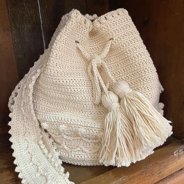 Todas las cajas llevan el material suficiente para hacer el patrón de la diseñadora o tienda, en este caso, 1 kilo de Eco crudo para tejer el Bolso Trafalgar y monedero a juego.