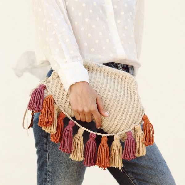 Se trata de un bolso tejido a crochet con cierre de boquilla rígida y decorado con unas bonitas borlas. Está elaborado con Veggie Wool Original de Casasol y el kit contiene todo lo necesario para que te hagas uno igualito al de Santa Pazienzia.